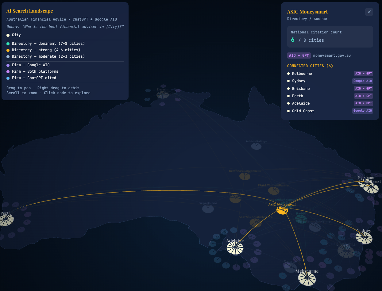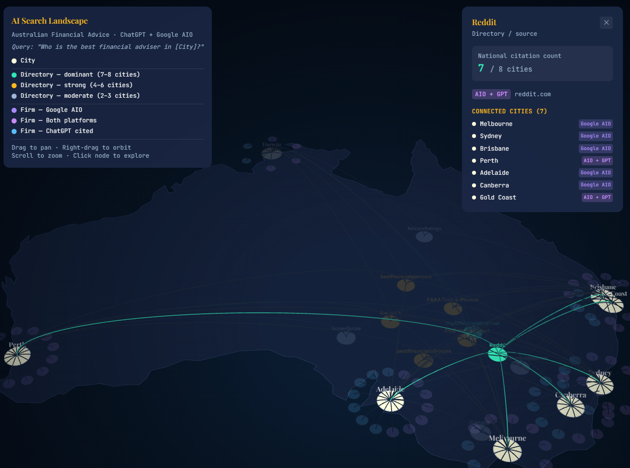 The same online directory drives AI financial adviser recommendations across every major Australian city. That finding comes from a 3D visualization of AI sourcing patterns now live, mapping which directories and firms Google AI Overviews and ChatGPT cite when answering "best financial planner in [city]" across 8 Australian cities.